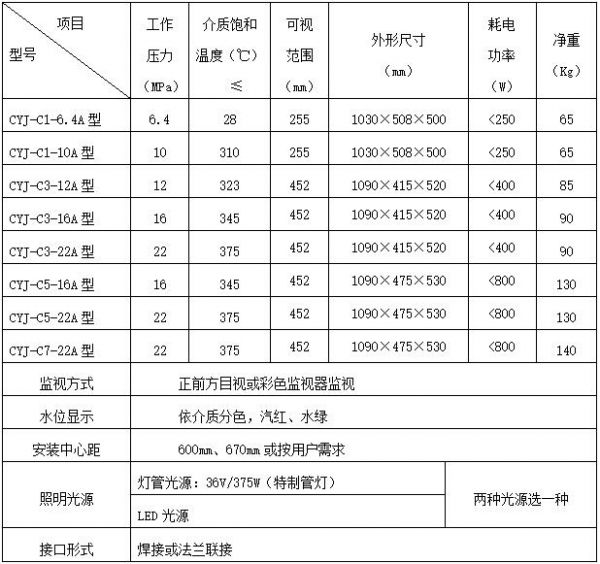 `CYJ型窗式高壓、超高壓彩色液位計(jì)是用于各發(fā)電廠(chǎng)、石油化工行業(yè)及各工礦企業(yè)的蒸汽鍋爐或其它壓力容器監(jiān)測(cè)水位的一次就地直讀儀表。它是在總結(jié)國(guó)內(nèi)外各種透射式雙色水位計(jì)優(yōu)點(diǎn)基礎(chǔ)上新研制的長(zhǎng)窗式高壓、超高壓雙色水位計(jì),用汽紅水綠顯示液位,無(wú)水全紅、滿(mǎn)水全綠。紅綠色界面即為實(shí)際水位。可在現(xiàn)場(chǎng)直接觀察也可以配我公司生產(chǎn)的彩色工業(yè)電視監(jiān)視系統(tǒng),在控制室內(nèi)的監(jiān)視器熒屏上遠(yuǎn)程監(jiān)測(cè)現(xiàn)場(chǎng)實(shí)際水位。它與其它雙色水位計(jì)相比較,具有如下幾種特點(diǎn):